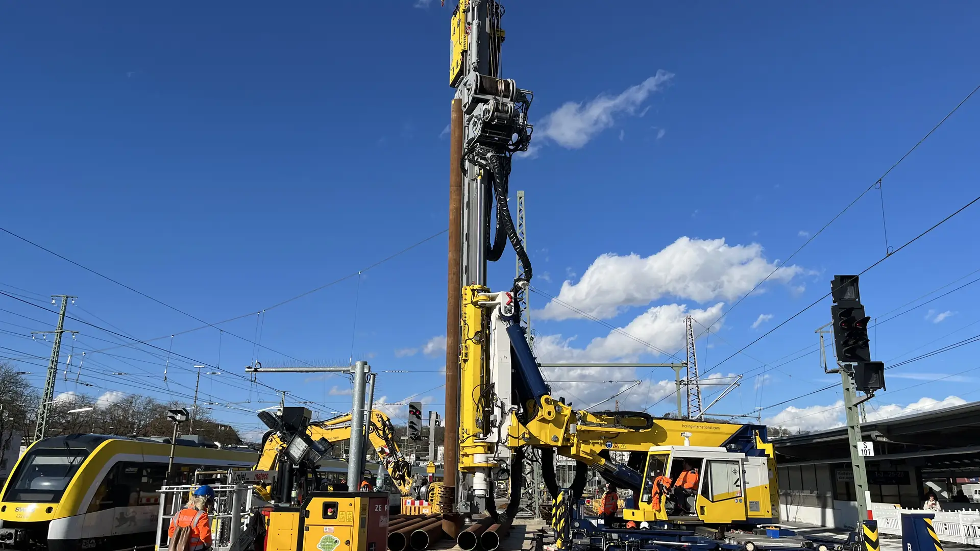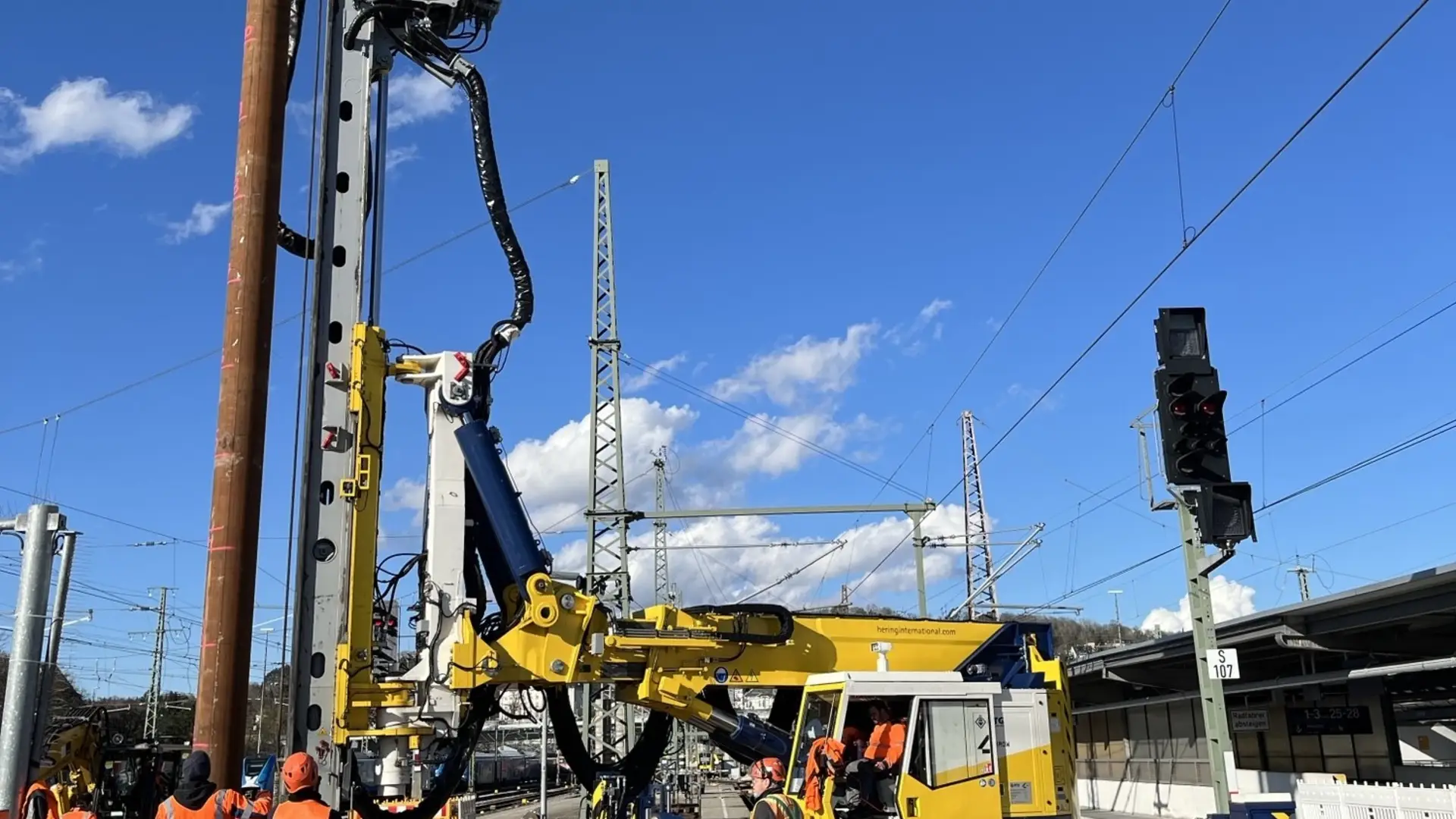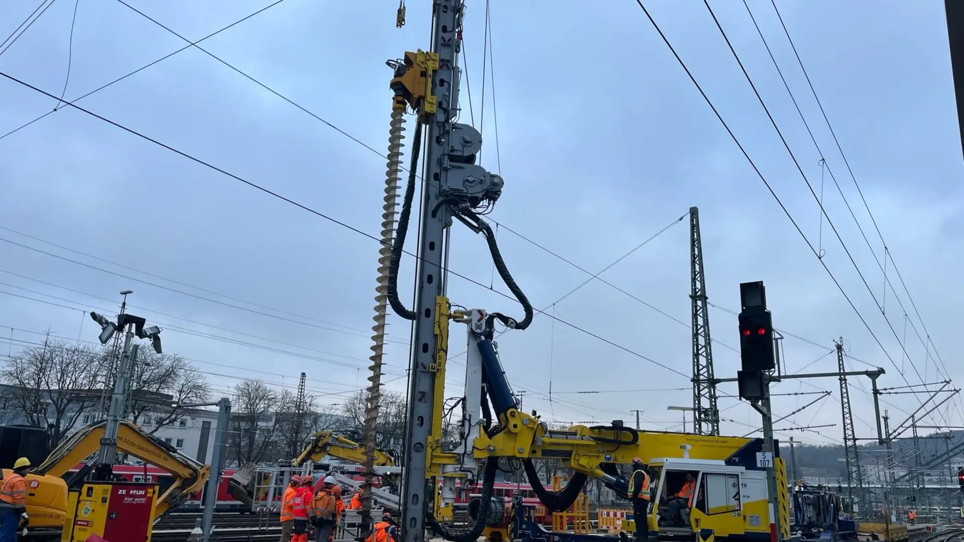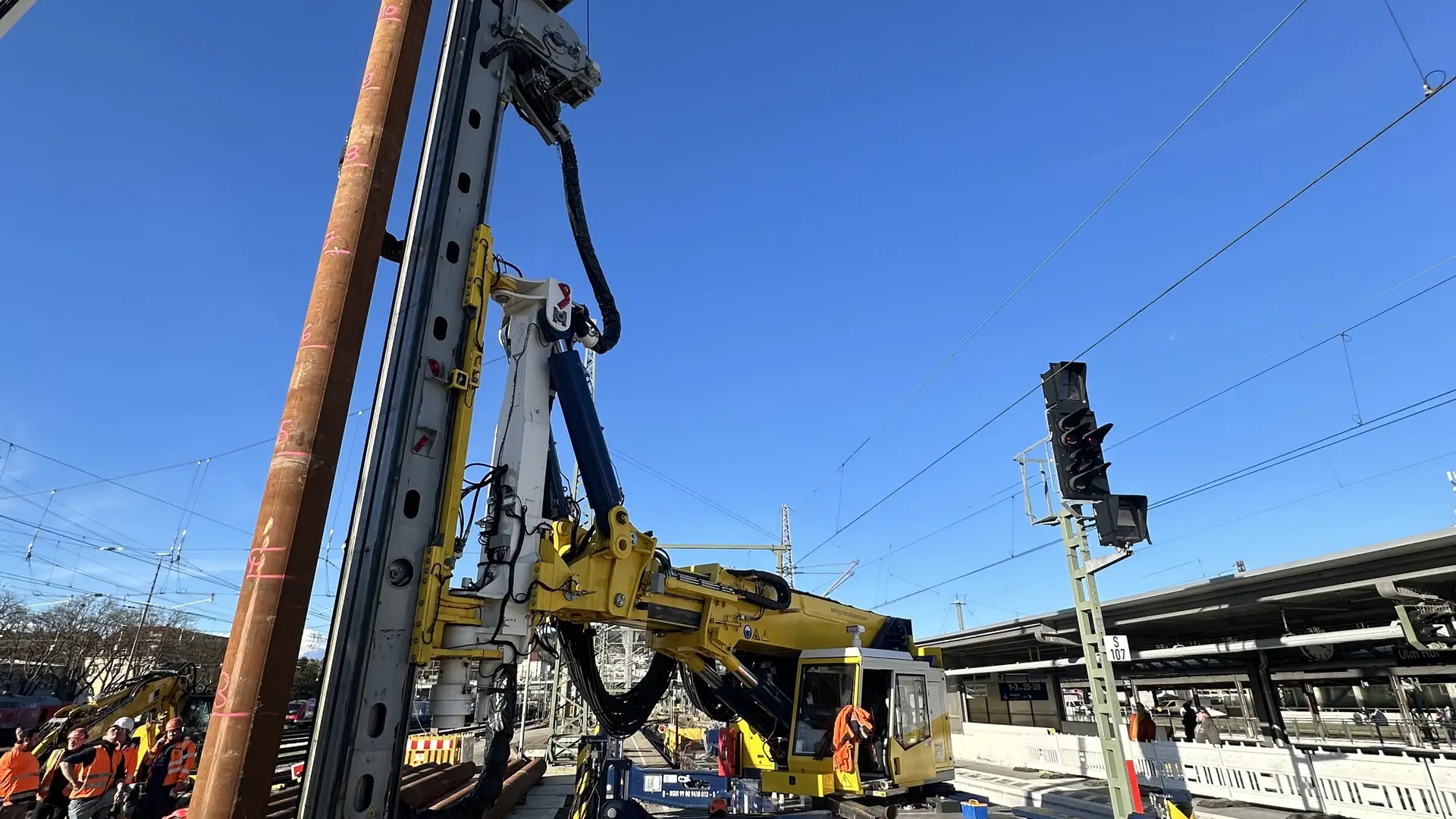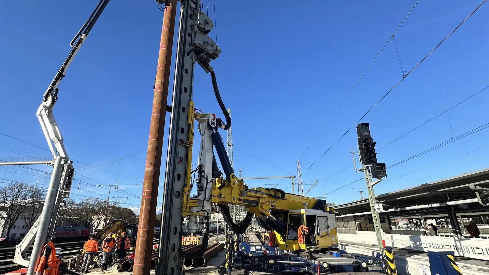Dort wurden an einem Bahnsteig zwischen den Gleisen 7 und 8 acht Rohre mit 508 mm Außendurchmesser und einer Länge von 13 Metern komplett in den Boden eingebracht. Aufgrund des herausfordernden Untergrunds war es für die Pfahlgründung notwendig, erst zu rütteln, dann zu hämmern und anschließend mit einem MB Bohrantrieb und einer Endlosschnecke den Boden auszubohren. Entstanden ist so das Fundament für einen neuen Signalausleger, der über zwei Gleise hinweg künftig die Steuerung des Fernverkehrs unterstützen soll. Denn aufgrund einer bestehenden Überdachung beim Nachbargleis war es nicht möglich, einfach eine Signalbrücke zu bauen.