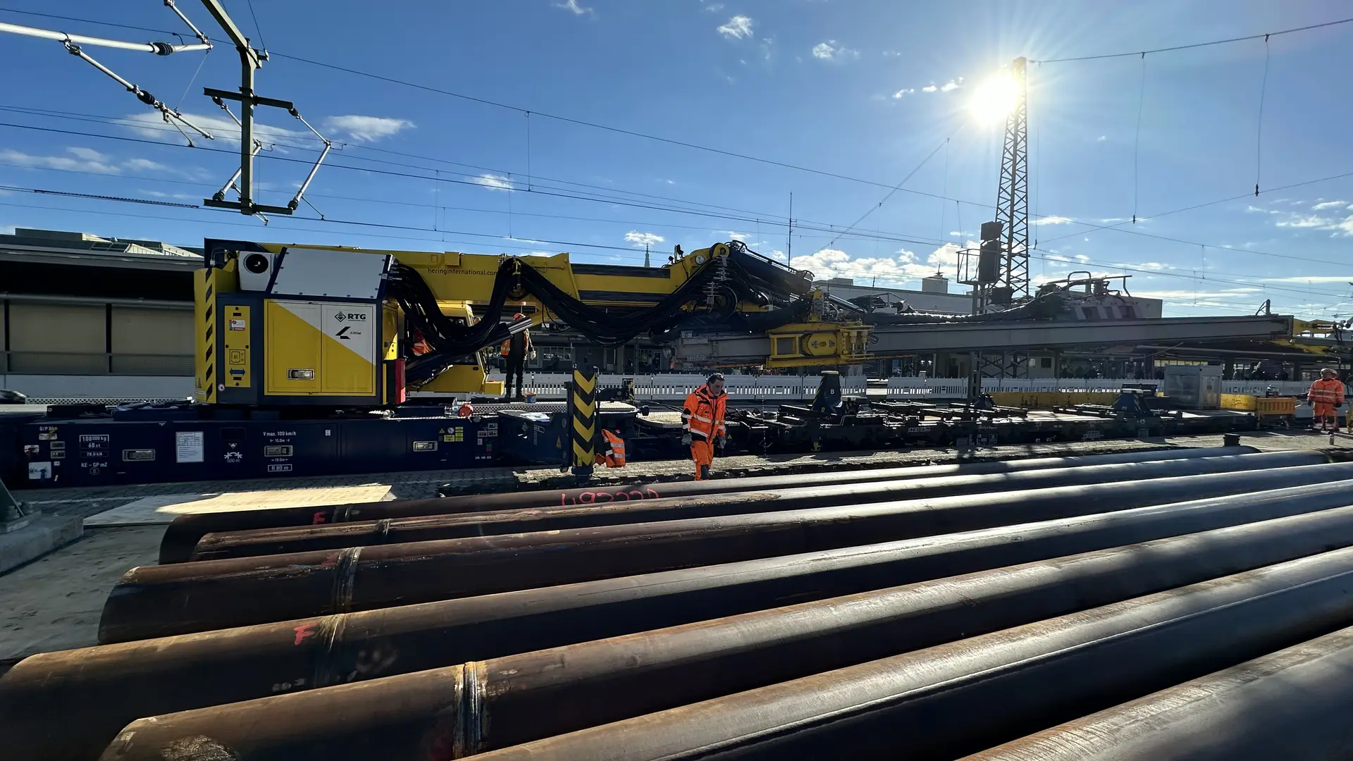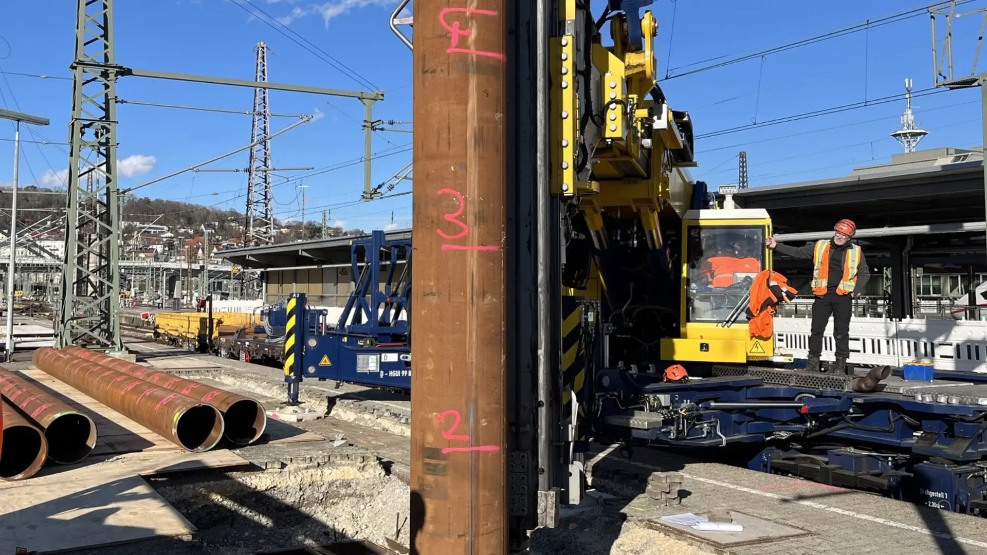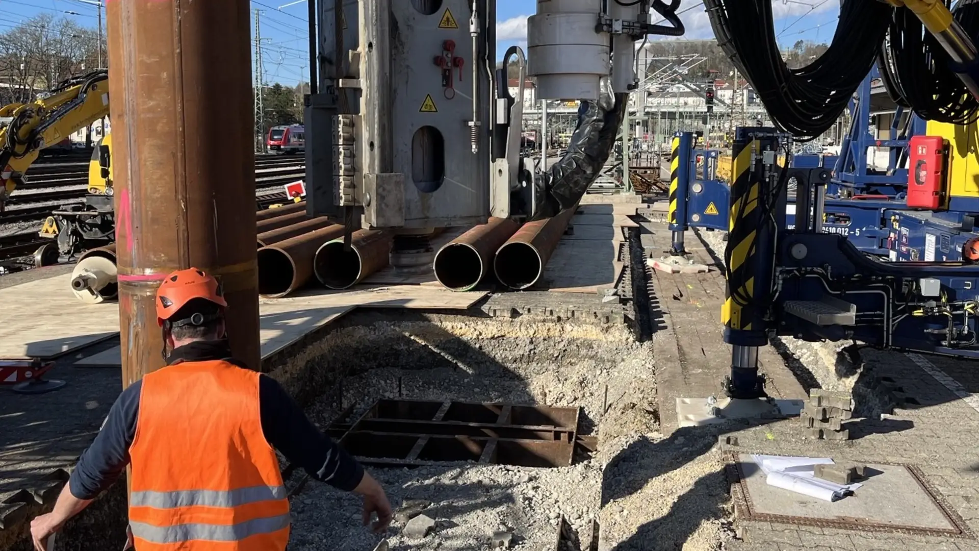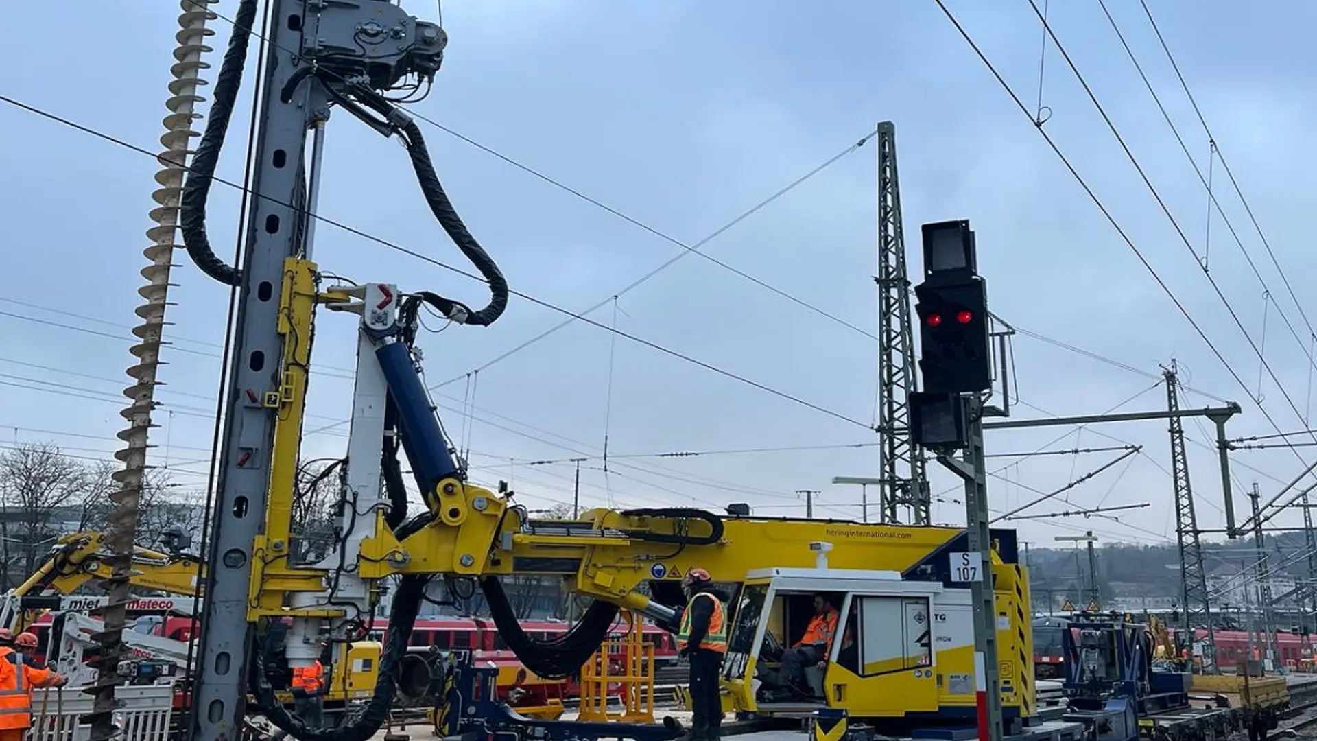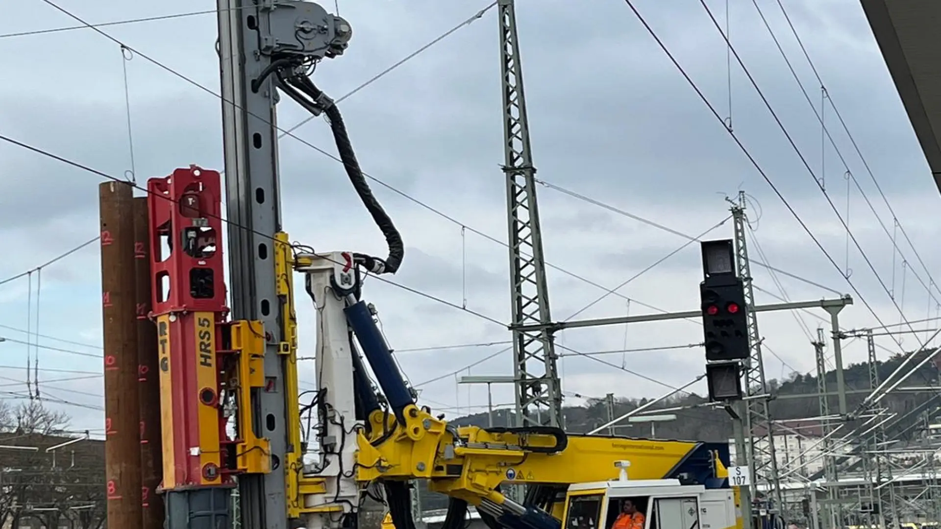 Dort wurden an einem Bahnsteig zwischen den Gleisen 7 und 8 acht Rohre mit 508 mm Außendurchmesser und einer Länge von 13 Metern komplett in den Boden eingebracht. Aufgrund des herausfordernden Untergrunds war es für die Pfahlgründung notwendig, erst zu rütteln, dann zu hämmern und anschließend mit einem MB Bohrantrieb und einer Endlosschnecke den Boden auszubohren. Entstanden ist so das Fundament für einen neuen Signalausleger, der über zwei Gleise hinweg künftig die Steuerung des Fernverkehrs unterstützen soll. Denn aufgrund einer bestehenden Überdachung beim Nachbargleis war es nicht möglich, einfach eine Signalbrücke zu bauen.