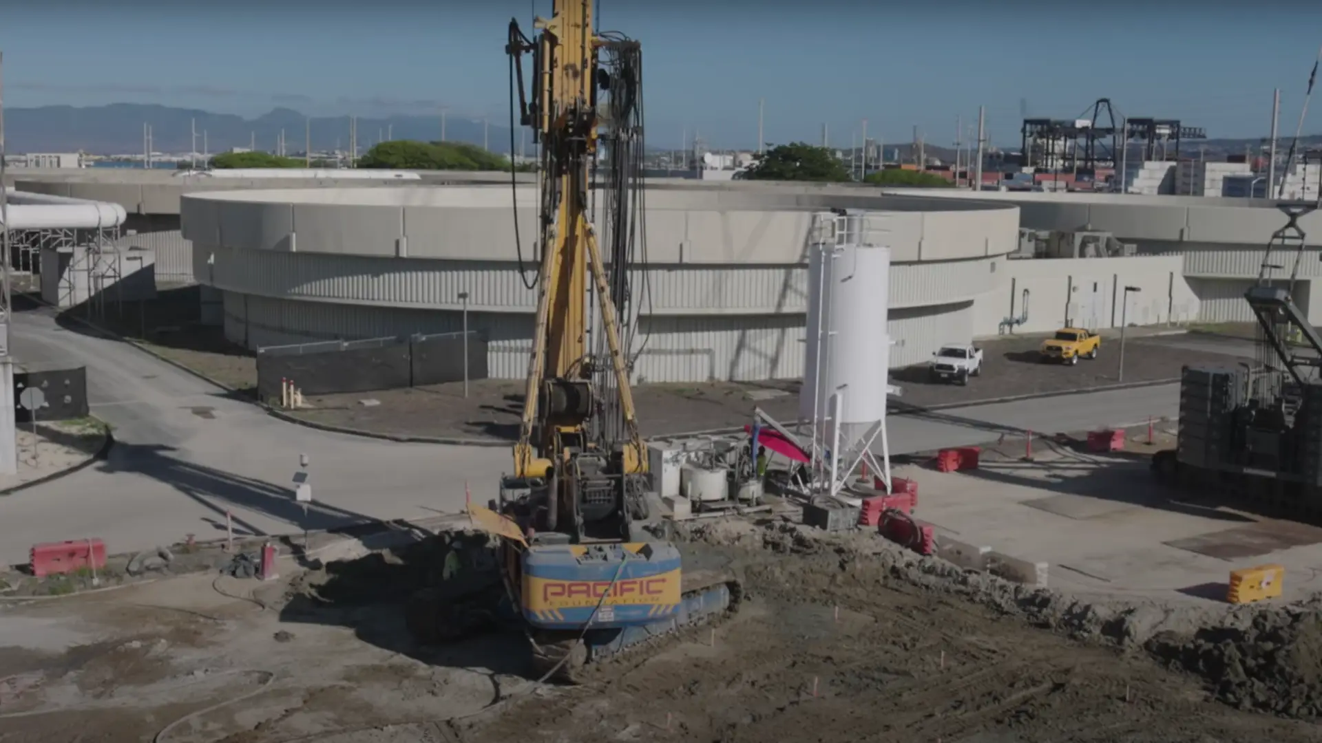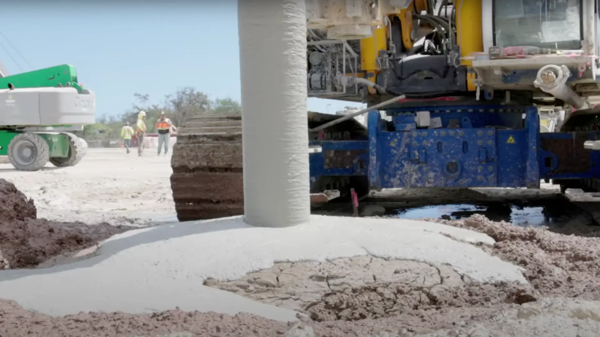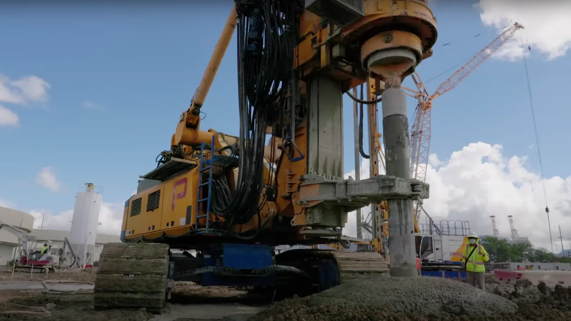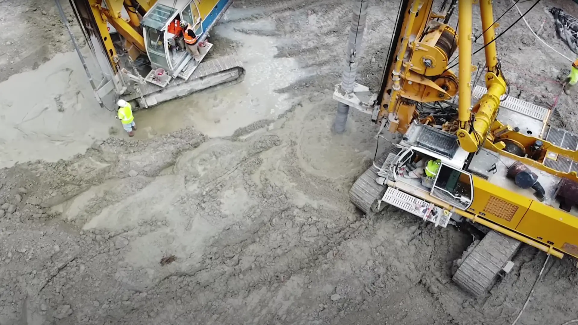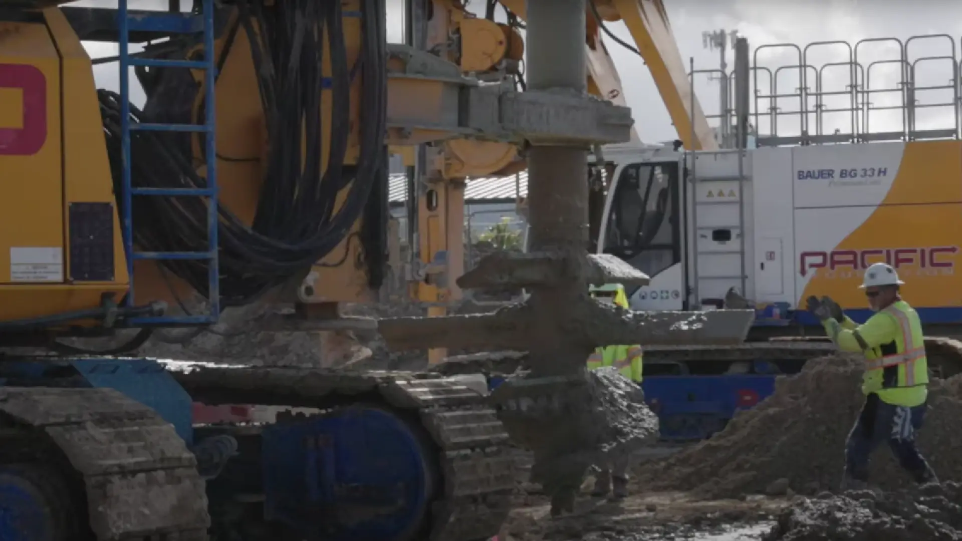 The specialist foundation engineering company Pacific Foundation used its two BAUER BGs, a BG 33 and a BG 40, to carry out large-scale ground improvement using the Single Column Mixing (SCM) method and to inject a special high-quality cement mixture into the ground. First, the ground was pre-drilled with auger drills, something that is not usual in the SCM process, but is due to the hard and difficult ground conditions. Only then could the soil be mixed with mixing paddles and simultaneously injected with the respective binding agent.