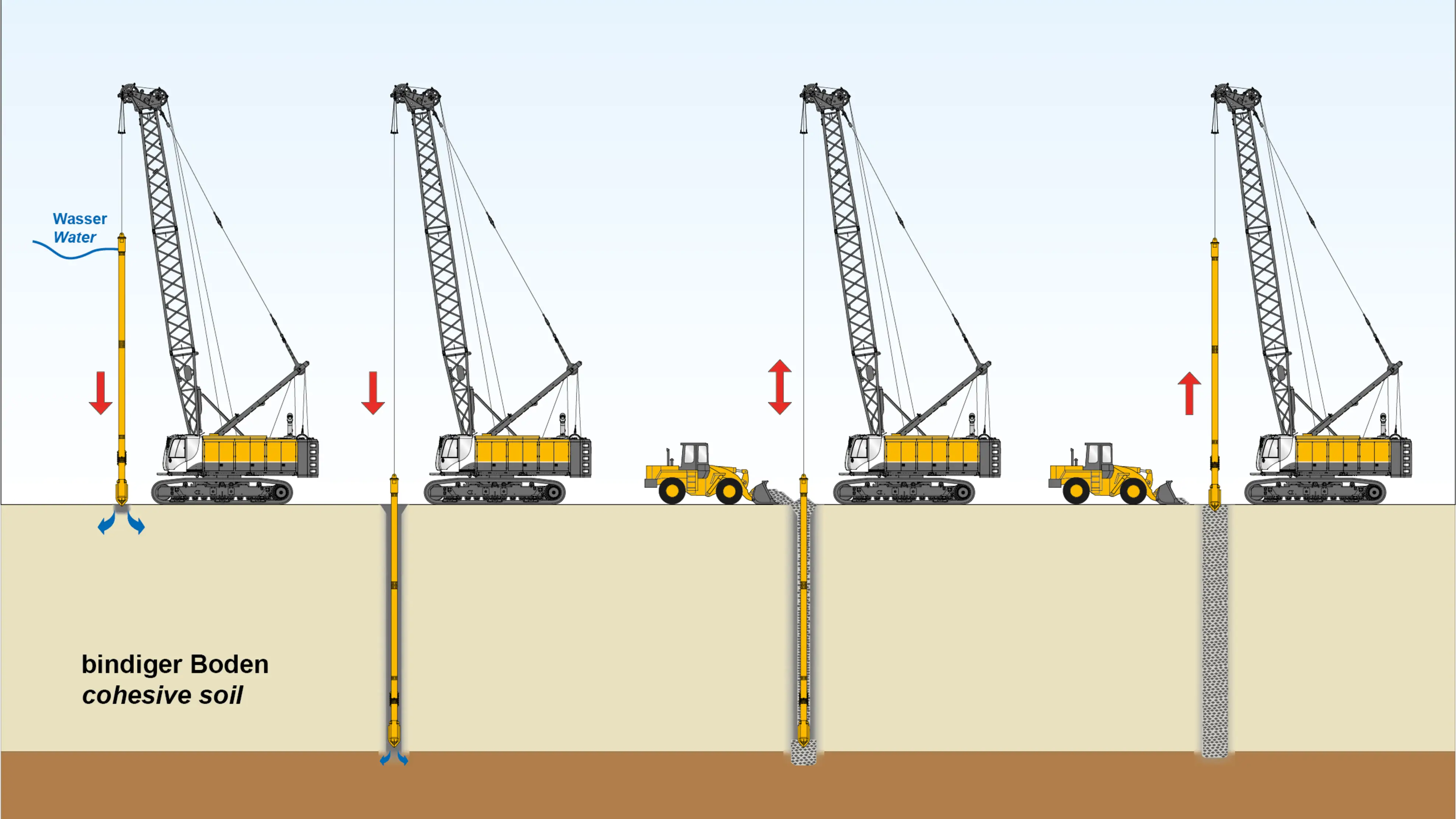 Soils with more than 10 % cohesive particles can no longer be moved and compacted using vibrations. The soil improvement that can be achieved here comes from the construction of load-bearing gravel columns. For VR “Top Feed”, the vibrator is brought to the end depth with the help of water or water/air. The installation material added at the surface reaches the vibrator tip through the annular gap that is created. Through continual tamping movements, the material is radially displaced and compacted until a pre-defined stopping factor (hydraulic pressure, gravel volume) is reached.
