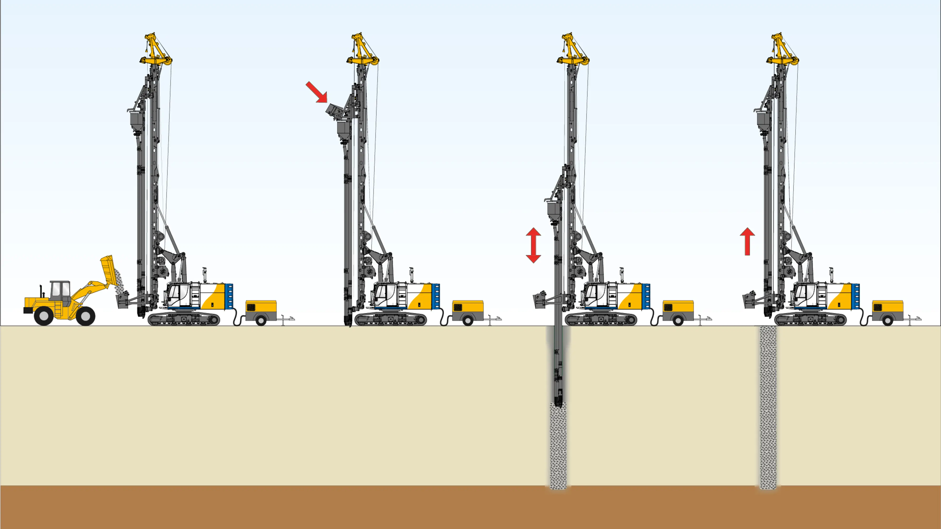 Vibro Replacement can be used in granular soils with a high proportion of fine grains as well as in cohesive soils. With the “Bottom Feed” VR, however, the leader-guided bottom feed vibrator is brought to the end depth supported flushing air on tip and active crowd force. The installation material is transported directly to the outlet on the vibrator tip using a feed unit and charging pipe, then radially displaced and compacted in tamping stages. The tamping pattern (quantity, pressure) is defined and monitored individually.