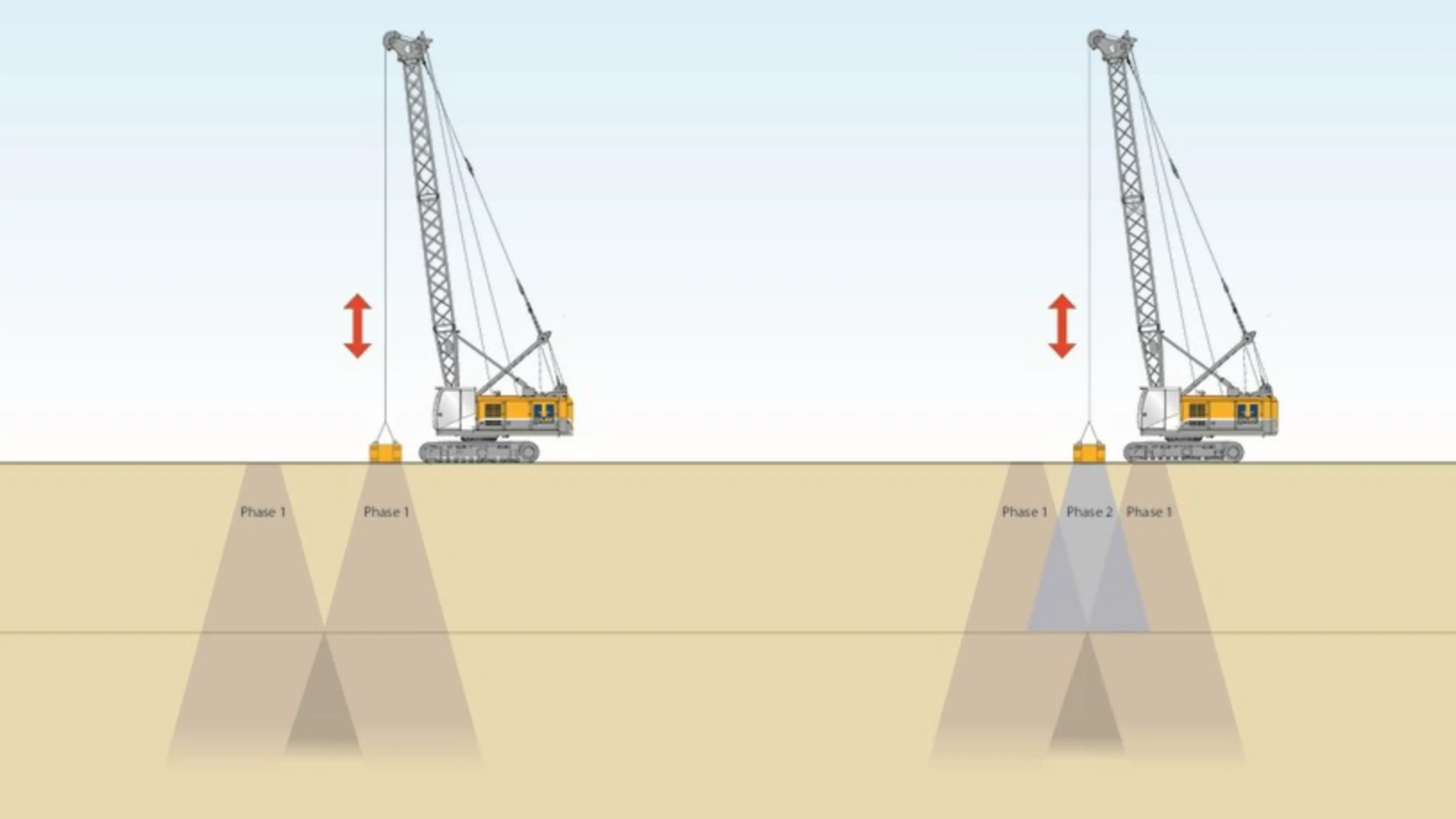 In practice, steel plates with a total weight of 25 tonnes are welded together to form so-called pounders and pulled upwards using a cable excavator. In a controlled free fall, they are then rammed 9 to 15 times onto the ground, where a crater is formed by the impacts. The devices are then moved on to the next compaction point according to a defined pattern. This creates an impressive grid of craters. After this first phase, the areas between the individual craters are treated with the pounders in a second phase to achieve an even surface compaction. These staggered, overlapping effects ultimately result in an area-wide soil compaction from a point-by-point compaction. Six Bauer MC 96, among others, are currently on site to prove themselves under the difficult conditions.